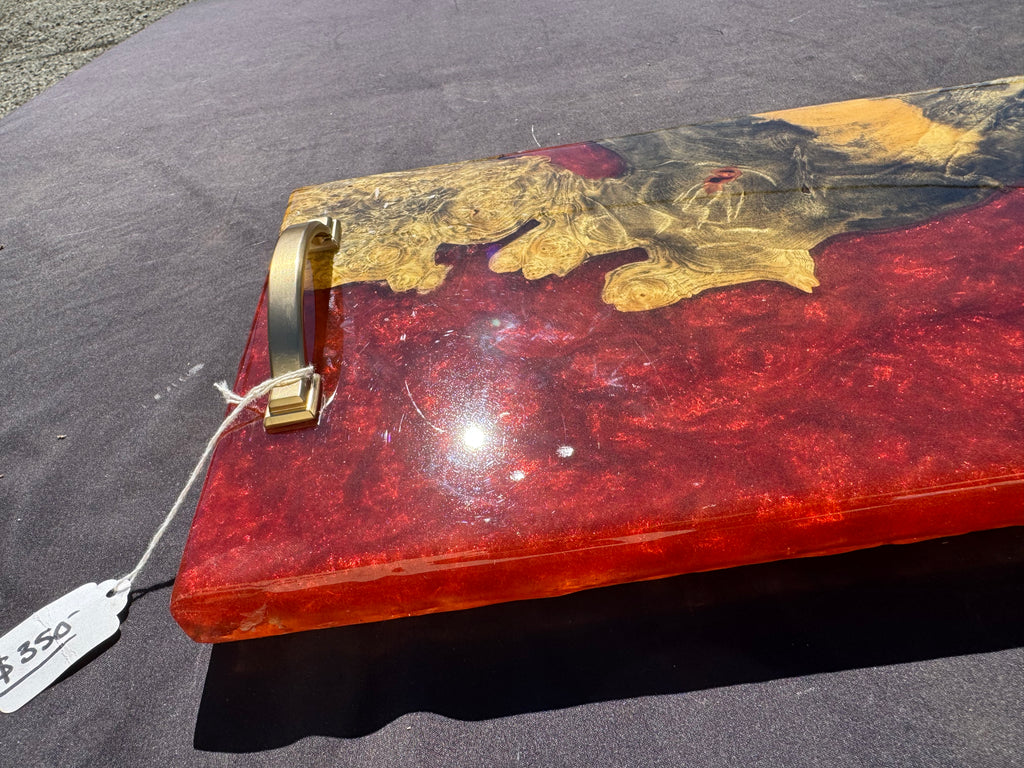 This is a wood/epoxy serving board made from beautiful California buckeye burl and red epoxy. Please examine the picture before purchasing as this has a handful of dings and dents that are shown in the pictures.
