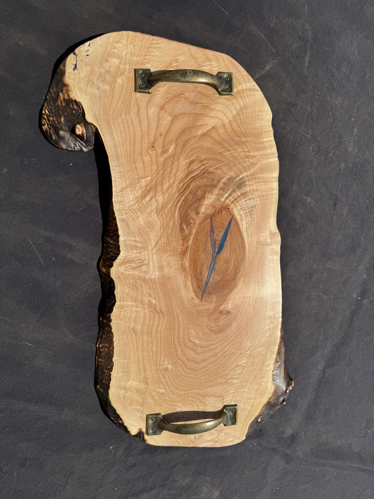 This is a beautiful serving tray made from curly maple and the help of a little epoxy to fill the voids near the middle. You will notice the epoxy is a shimmering mix deep blue and lighter purple.