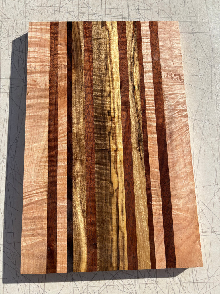 This is an unfinished figured maple, Myrtle and walnut glue up cutting board available for sale as is (unfinished DIY) or customized and finished as you choose. This piece is currently glued up, jointed and planed but not sanded. The Dimensions are currently (19 1/2 x 12 ⅝ x 1 ) and may change slightly with customizations.