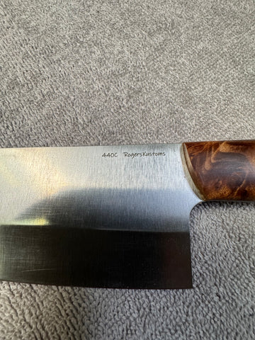 HANDLE MATERIAL: Custom curly Maple burl, ergonomic grip, and durable rivets