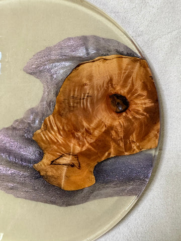 Measuring approximately 14 inches in diameter, this piece isn't just practical—it’s a true work of art. The color and sparkles make you feel like your holding a galaxy in your hands creating a seamless and visually striking composition that makes this wood and epoxy board a showstopper in any room.