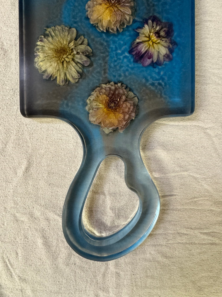 Measuring approximately 25x8.5 inches, this piece isn't just practical—it’s a true work of art. The flowers float gracefully creating a seamless and visually striking composition that makes this epoxy board a one of a kind showstopper in any room.