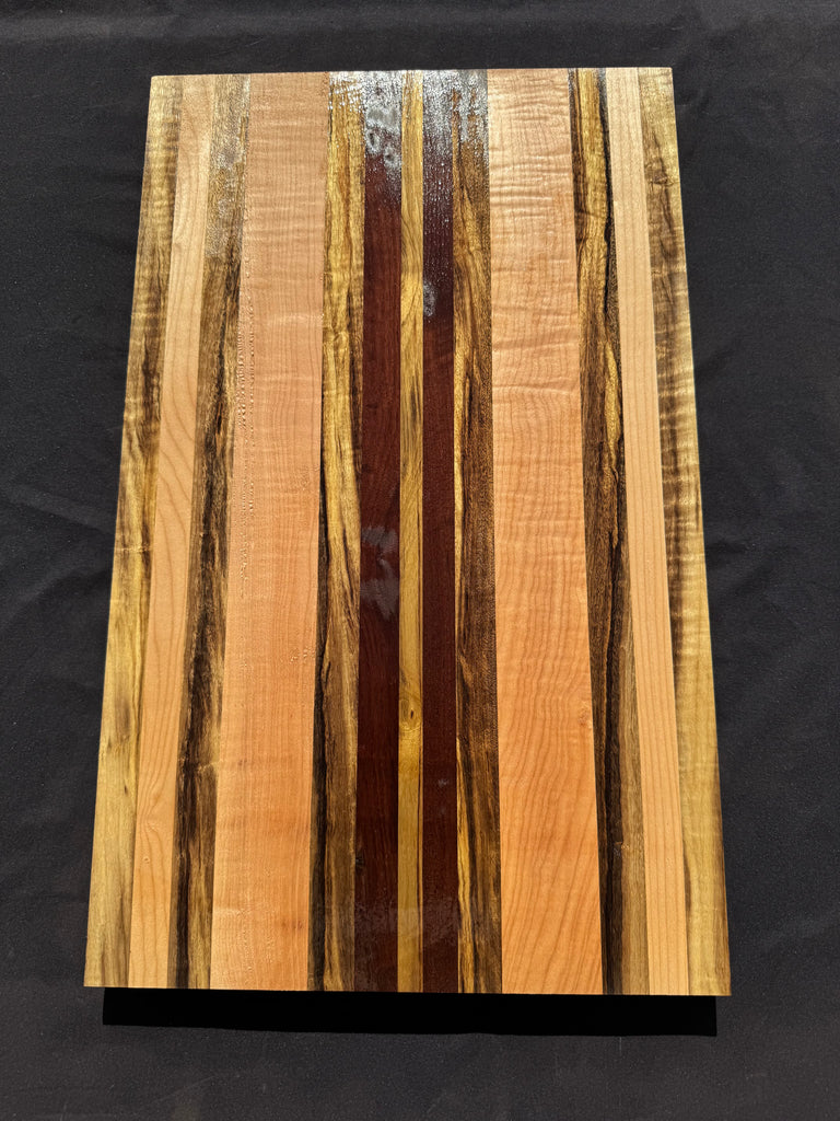 This is an unfinished figured maple, Myrtle and walnut glue up cutting board available for sale as is (unfinished DIY) or customized and finished as you choose. This piece is currently glued up, jointed and planed but not sanded. The Dimensions are currently (21 ⅛ x 13 x 1 ⅛ ) and may change slightly with customizations.