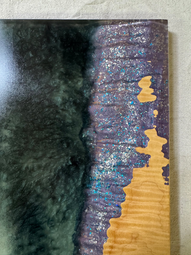 Elevate your dinning presentation with this exquisite Maple & Epoxy cheese & charcuterie board, a true masterpiece that seamlessly blends artistry and functionality. Custom-crafted in-house with instrument grade maple enhanced by the captivating epoxy ocean design that adds a modern, artistic touch to your table.