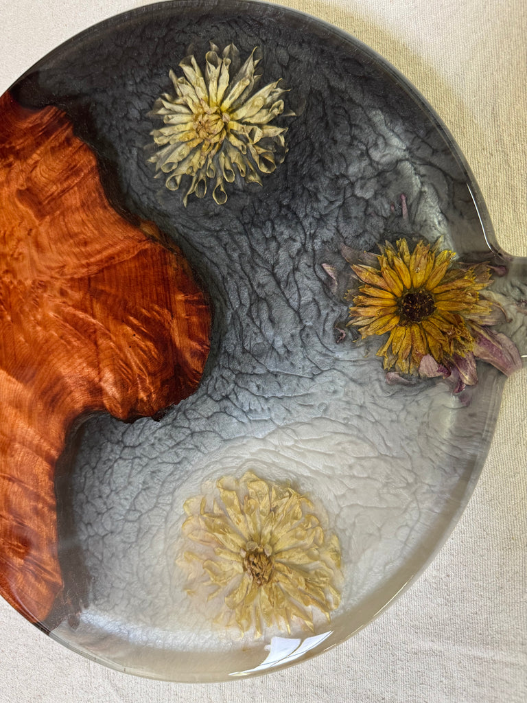 Measuring approximately 14 inches in diameter, this piece isn't just practical—it’s a true work of art. The flowers float gracefully creating a seamless and visually striking composition that makes this wood and epoxy board a one of a kind showstopper in any room.
