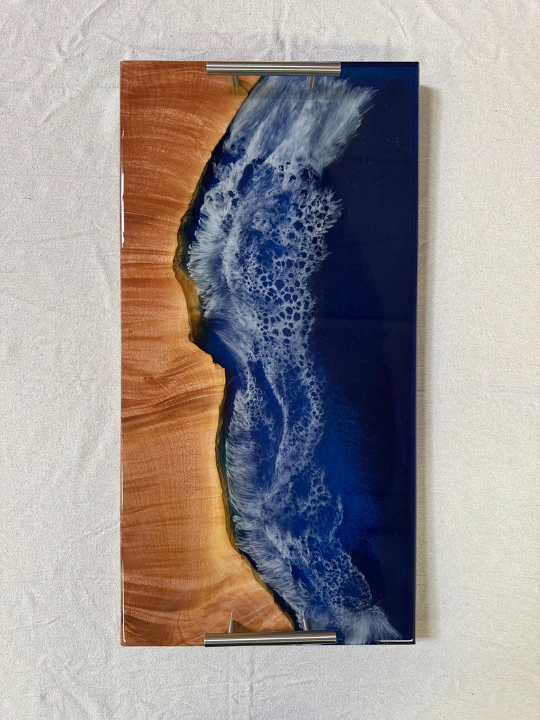 Elevate your dinning presentation with this exquisite Maple & Epoxy serving tray, a true masterpiece that seamlessly blends artistry and functionality. Custom-crafted in-house with instrument grade maple enhanced by the captivating epoxy ocean design that adds a modern, artistic touch to your table.